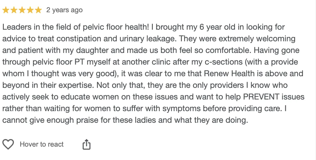 By choosing Renew Health, you're prioritizing your pelvic health with a team of dedicated specialists who have the freedom to provide the highest standard of care, unrestricted by the limitations often imposed by in-network arrangements. Our commitment to excellence means putting your health and well-being first, every step of the way - without insurance companies dictating how we work with you. We work for our patients, not for insurance companies. Our approach addresses root causes rather than just managing symptoms, often leading to more sustainable health improvements and long-term cost savings.